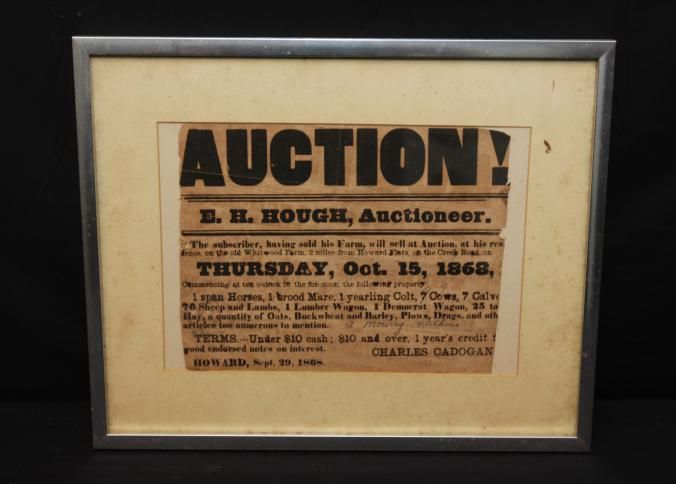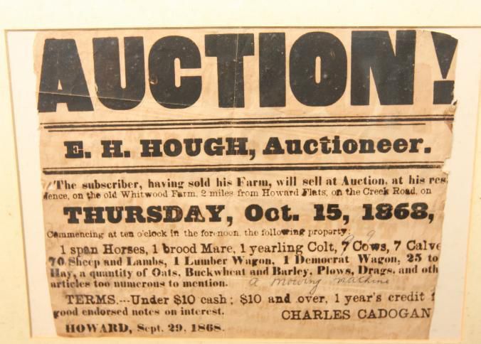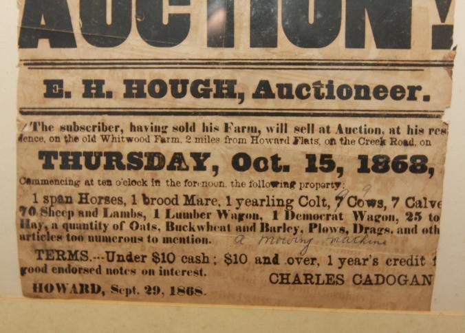 FR. 1868 FARM AUCTION BROADSIDE. 8X10". E.H. HOUGH AUCTIONEER. "THE SUBSCRIBER, HAVING SOLD HIS FARM, WILL SELL AT AUCTION AT HIS RESIDENCE ON THE OLD WHITWOOD FARM, 2 MILES FROM HOWARD FLATS ON THE CREEK ROAD ON THURSDAY OCT. 15, 1868, COMMENCING AT TEN O'CLOCK IN THE FORENOON, THE FOLLOWING PROPERTY: 1 SPAN OF HORSES, 1 BROOD MARE, 1 YEARLING COLT, 7 COWS (CHANGED TO 9 BY HAND WRITING), 7 CALVES, 70 SHEEP AND LAMBS, 1 LUMBER WAGON, 1 DEMOCRAT WAGON, 25 TONS OF HAY, A QUANTITY OF OATS, BUCKWWHEAT AND BARLEY, PLOWS, DRAGS, AND OTHER ARTICLES TO NUMEROUS TO MENTION. ADDED IN SCRIPT BY AUCTIONEER "A MOWING MACHINE". THE TOWN WAS "HOWARD". NO STATE GIVEN. AUCTIONS WERE LOCAL EVENTS.Created By