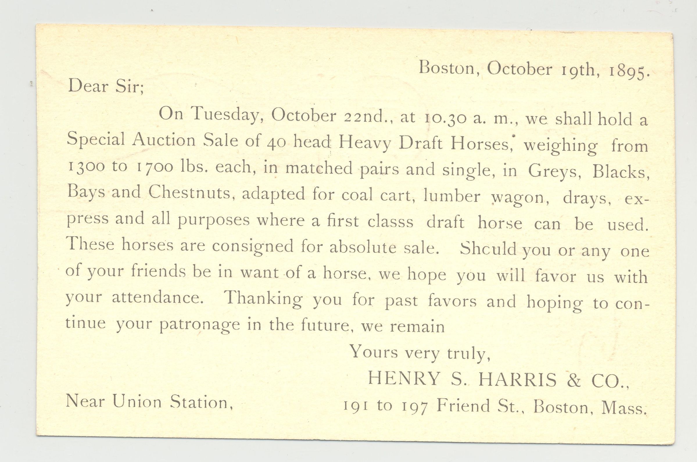 PSTCD, 1895 AUCTION NOTICE POSTCARD DRAFT HORSES FROM HENRY S. HARRIS CO. BOSTON, MA GREAT ADVERTISING.Created By