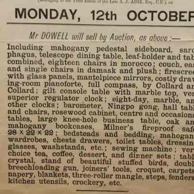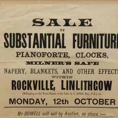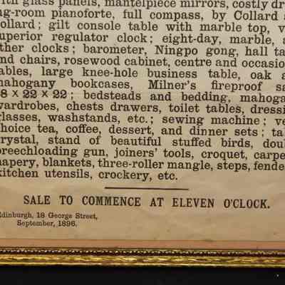 FR. 1896 ESTATE AUCTION BROADSIDE. 10X15". SUBSTATIAL FURNITURE, PIANOFORTE, CLOCKS, DRAPERY, BLANKETS,Created By