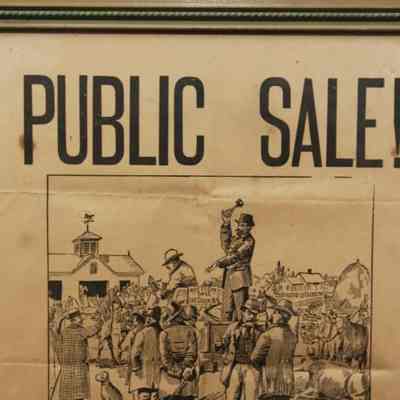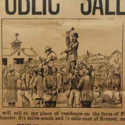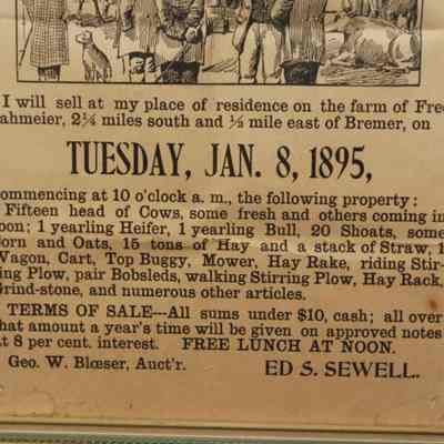 FR. 1895 PUBLIC FARM SALE BROADSIDE. 9X12 1/2". FREE LUNCH. 15 COWS HEIFER BULL 20 SHOATS CORN OATS 15 TONS HAY, WAGON CART - TOP BUGGY - MOWER - HAY RAKE - RIDING PLOWCreated By