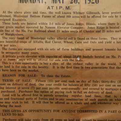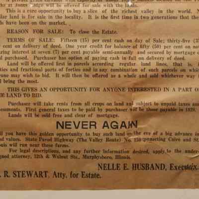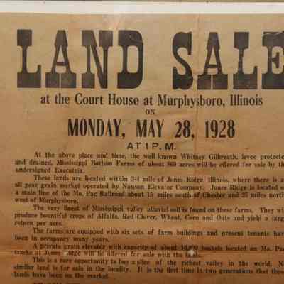 FR. ILL. 1928 LAND SALE BROADSIDE. .8 1/4X11". (MURPHYSBORO) MISSISSIPPI BOTTOMS FARMS OF 869 ACRES. GREAT SALESMANSHIP IN THE DETAILS. GREAT FOR ALFALFA, RED CLOVER, WHEAT, CORN AND OATS.Created By