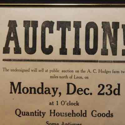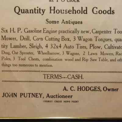 FR. 19THC FARM AUCTION BROADSIDE. 9X11 1/2". MON. DEC. 23D. - 1 O' CLOCK A. C. HODGES FARM SIX H.P. ENGINE PRACTICALLY NEW, CARPENTER TOOLS - MOWER - DRILL - CORN CUTTING BOX - 3 WAGON TONGUES - LUMBER - SLEIGH - AUTO TIRES - PLOW - CULTIVATOR - WAGONS. AUCTIONEER - JOHN PUTNEYCreated By