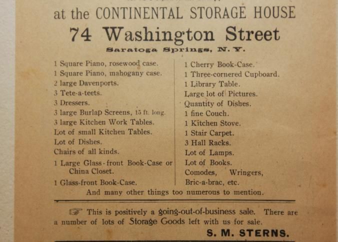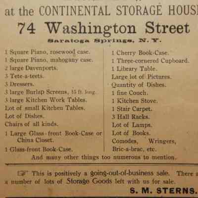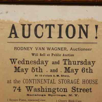 FR. 19THC STORAGE AUCTION BROADSIDE. 5 3/4X8. GOING OUT OF BUSINESS AUCTION FOR "CONTINENTAL STORAGE HOUSE 74 WASHINGTON STREET, SARATOGA SPRINGS, NY" - AUCTIONEER - RODNEY VAN WAGNER. NO DATE. GREAT LISTING OF ITEMS.Created By