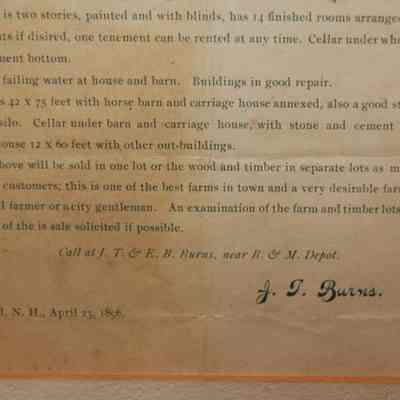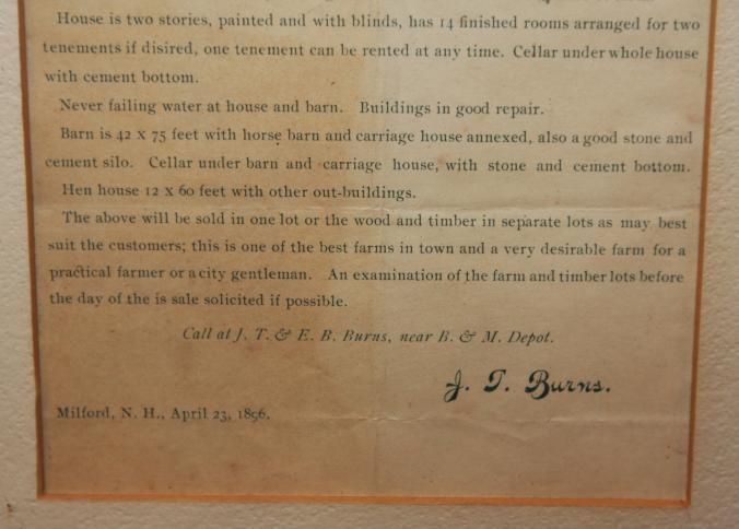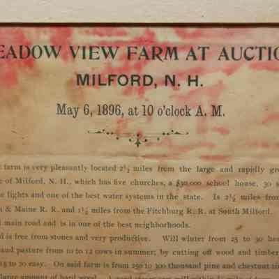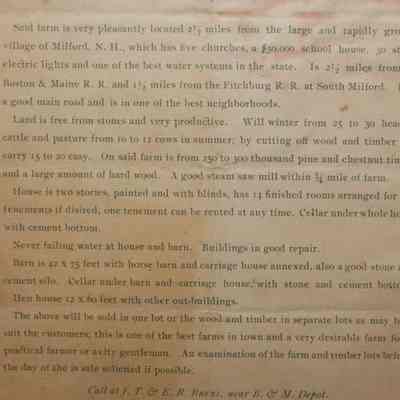 FR. 1896 NH FARM AUCTION BROADSIDE. 5X7". THIS AUCTION COMMENCING AT 10AM IS A COMPLETE LIQUIDATION INCLUDING REAL ESTATE. FARM LOCATED IN MILFOR, NH. GREAT DETAIL ON PERSONAL AND REAL PROPERTY TO BE SOLD.Created By