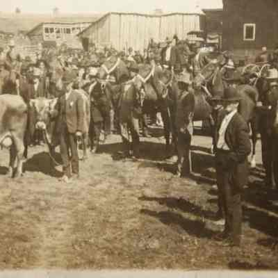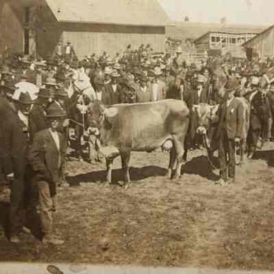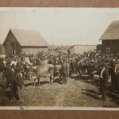 FR. 19THC FARM AUCTION PHOTO. 5X7". MOUNTED ON CARDBOARD THE SCENE SHOWS A LARGE CROWD AND COWS WITH BARNS AND OUTBUILDINGS.Created By