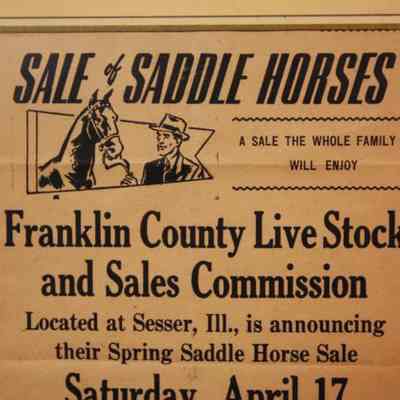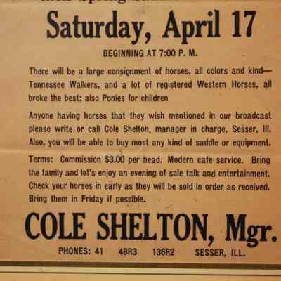FR. 20THC "SALE OF SADDLE HORSES". 8X9 1/2". VIGNETTE OF MAN WITH HORSE IN TOP LEFT. "A SALE THE WHOLE FAMILY WILL ENJOY" HELD AT FRANKLIN COUNTY LIVESTOCK AND SALES COMMISSION SESSER, ILL. SPRING AUCTION SAT. APRIL 17TH 7PM.cOMMISSION WAS $3. A HEAD. COLE SHELTON, MGR. PHONE #41.Created By