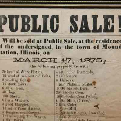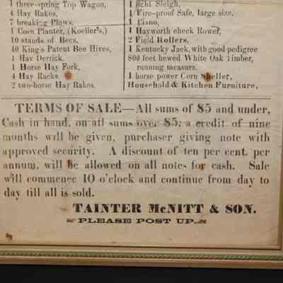 FR. 1875 ILL. FARM AUCTION BROADSIDE. 8 1/2X12 1/2". AUCTIONEERS "TAINTER MC NITT & SON" OFFERED A SUBSTANTIAL LISTING OF LIVESTOCK, WAGONS, BUGGIES, EQUIPMENT, TIMBER AND CROPS AT AUCTION IN THE TOWN OF MOUND STATION, ILLINOIS ON MARCH 17TH AT 10AM TO CONTINUE DAY TO DAY UNTIL ALL IS SOLD.Created By