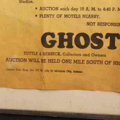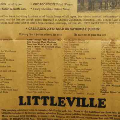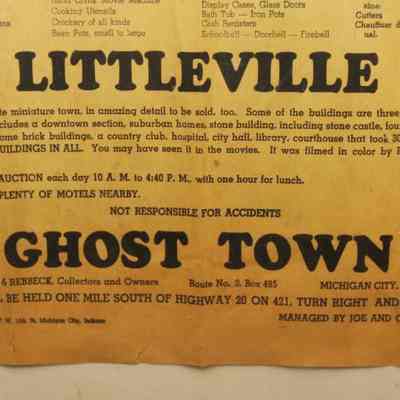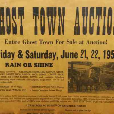 FR. 1957 IND. "GHOST TOWN AUCTION" BROADSIDE. 12X17 1/2". "ENTIRE GHOST TOWN FOR SALE AT AUCTION FRI. & SAT. RAIN OR SHINE. A MILLION ITEMS - INCLUDING MINIATURE TOWN - "LITTLEVILLE". MICHIGAN CITY, IND. TREMENDOUS LISTING ALONG WITH VIGNETTE OF HORSEDRAWN CHICAGO POLICE WAGON. "NOTHING LIKE IT BEFORE OFFERED FOR SALE."Created By