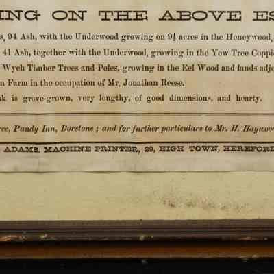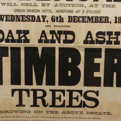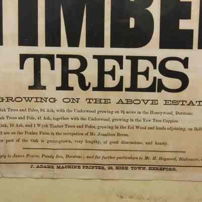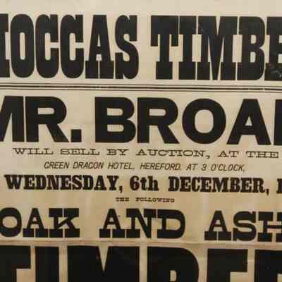 FR. 1871 "MOCCAS TIMBER TREES" BROADSIDE. 17 1/4X22". FANTASTIC ENGLISH BROADSIDE HAVING 10 DIFFERENT SIZE TYPE INVOLVED IN THE ADVERTISING OF "OAK AND ASH TIMBER TREES" BEING SOLD IN 3 LOTS FOR MR. BROAD'S ESTATE BY AUCTIONEER JAMES PEARCE AT PANDY INN. THE WORD "TIMBER" IS PRINTED IN 4" TALL LETTERS!Created By