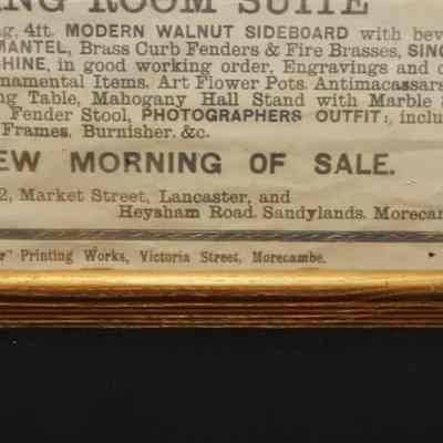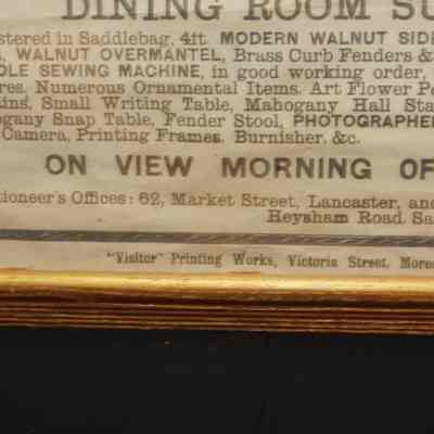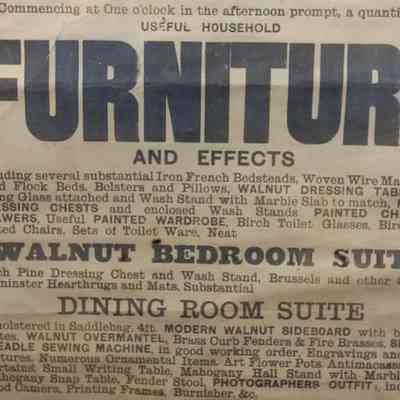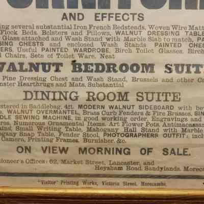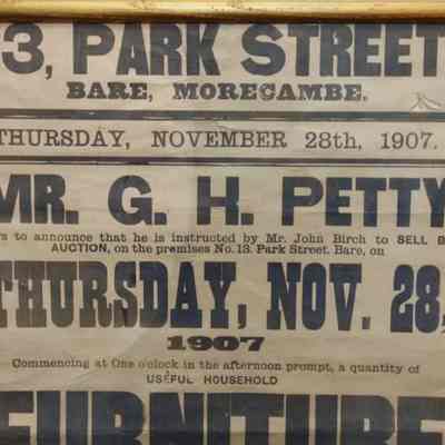 FR. 1907 CONTENTS OF HOME AUCTION BROADSIDE. 20X28". AUCTIONEER JOHN BIRCH WAS SELLING FOR G.H. PETTY THE CONTENTS OF HIS HOME AT 13 PARK ST., BARE, AT 1PM. GREAT LISTING OF FURNITURE, PHOTOGRAPHER'S OUTFIT, ENGRAVINGS, CURTAINS, ETC. AUCTIONEER'S OFFICES LOCATED #2 MARKET ST. LANCASTER.Created By