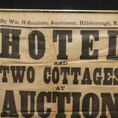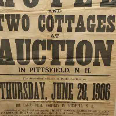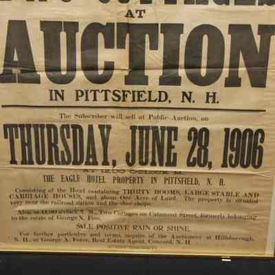 FR. NH "HOTEL & 2 COTTAGES" AUCTION BROADSIDE. 20 1/2X27 1/2". ESTATE AUCTION TO SETTLE THE ESTATE OF GEORGE N. FOSS CONDUCTED BY AUCTIONEER WM. H. MANAHAN OF HILLSBOROUGH NH. REAL ESTATE AGENT WAS IN CONCORD NH - GEORGE A. FOSTER. AUCTION TOOK PLACE IN PITTSFIELD, NH. THE HOTEL HAD 30 ROOMS, LARGE STABLE AND CARRIAGE HOUSES AND ABOUT 1 ACRE OF LAND. ALSO AT 11:30AM 2 COTTAGES ON CATAMOUT ST. WERE TO BE SOLD. MASSIVE AND IMPRESSIVE.Created By