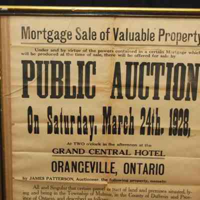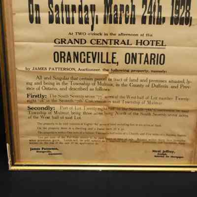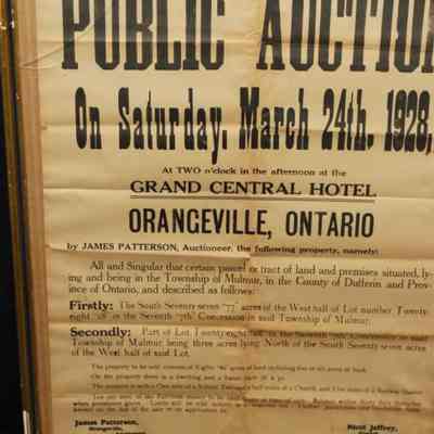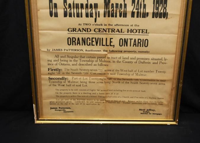 FR. 1928 CANADIAN REAL ESTATE AUCTION BROADSIDE. 18X23". AUCTIONEER JAMES PATTERSON FROM ORANGEVILLE SOLD THE GRAND CENTRAL HOTEL OF ORANGEVILLE, ONTARIO AT 2PM. GREAT DETAILED DESCRIPTION OF PROPERTY. 10% DOWN AND BALANCE IN 30 DAYS, SOLD SUBJECT TO RESERVE BID.Created By