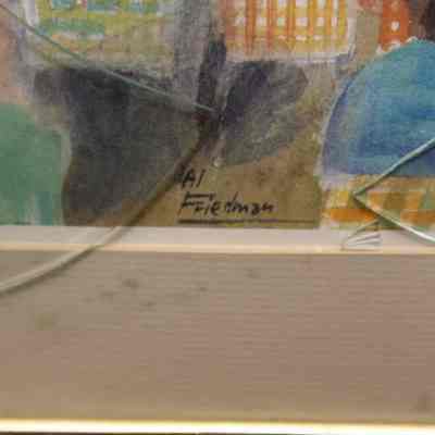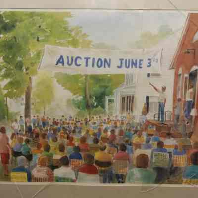 FR. SIGNED & NUMBERED PRINT ON-SITE AUCTION "JUNE 3RD". 15X21". "AL FRIEDMAN - 197/300. A DETAILED PRINT FROM AN ORIGINAL WATERCOLOR SHOWING A BANNER WITH AUCTION DATE OVER A LARGE SEATED AUCTION CROWD. AUCTIONEER AND ASSISTANTS ON THE STEPS OF BUILDING SELLING. MATTED AND FRAMED, READY TO HANG. SUPER!Created By