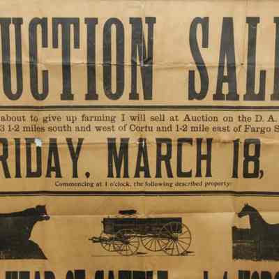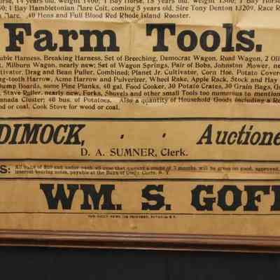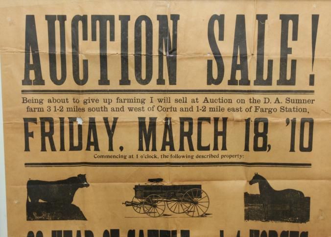 FR. 1910 NY FARM AUCTION BROADSIDE. 20X28". FANTASTIC "AUCTION SALE!" ADVERTISEMENT HAVING 3 VIGNETTES OF A COW, WAGON AND HORSE. AUCTIONEER D. DIMOCK WAS SELLING FOR WM. S. GOFF WHO DECIDED TO GIVE UP FARMING ALL THE LIVESTOCK, TOOLS, EQUIPMENT AND HOUSEHOLD ITEMS. GREAT DETAIL. A WONDERFUL, LARGE BROADSIDE. THE D.A. SUMNER FARM WAS LOCATED 3 1/2 MILES SOUTH AND WEST OF COFU AND 1-2 MILE EAST OF FARGO STATION.Created By