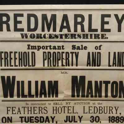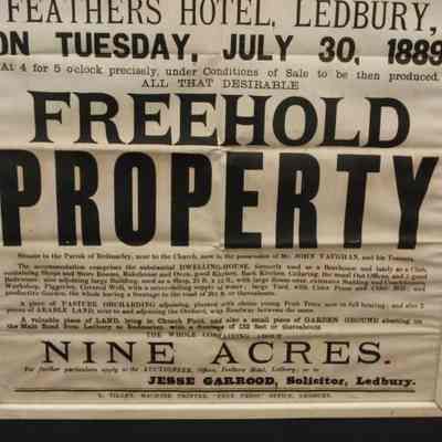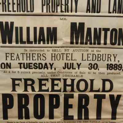 FR. 1889 REAL ESTATE BROADSIDE. 19X29". AUCTIONEER: WILLIAM MANTON WAS OFFERING "FREEHOLD PROPERTY & NINE ACRES OF LAND" AT THE FEATHERS HOTEL, LEDBURY "AT 4 FOR 5 O'CLOCK PRECISELY". A FANTASTIC MULTI-TYPE ENGLISH BROADSIDE WITH MUCH DETAIL REGARDING THE PROPERTIES BEING SOLD.Created By