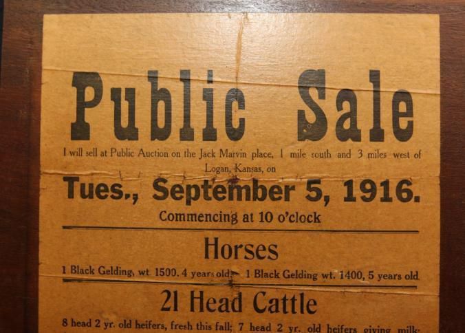 FR. 1916 KS FARM AUCTION BROADSIDE. 10X15". AUCTIONEER: COL. WM. PATTON WAS SELLING HORSES, CATTLE, FARM IMPLEMENTS AND HOUSEHOLD GOODS. "SPERRY LUNCH COUNTER ON GOUND" (NOTE: NOT A FREE LUNCH). THIS HANDBILL IS PASTED ON A BOARD JUST THE WAY THEY WOULD HAVE BEEN POSTED AT TIME OF AUCTION. A NICE KANSAS BROADSIDE.Created By