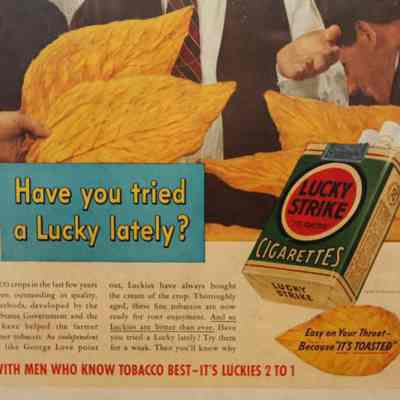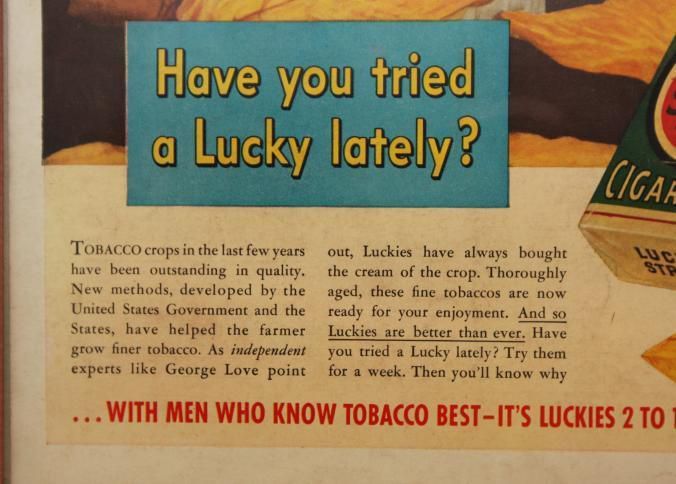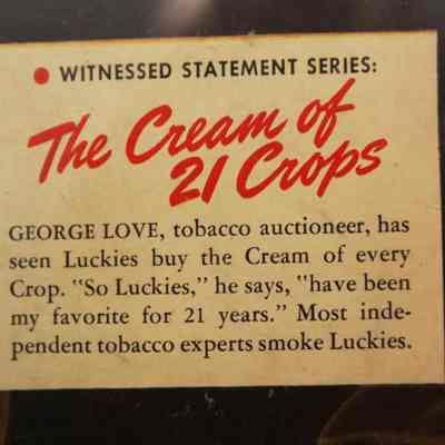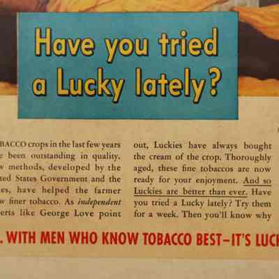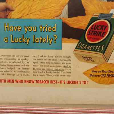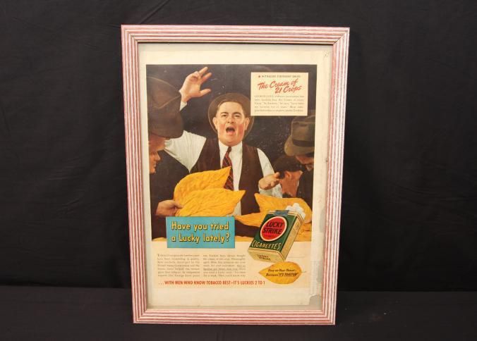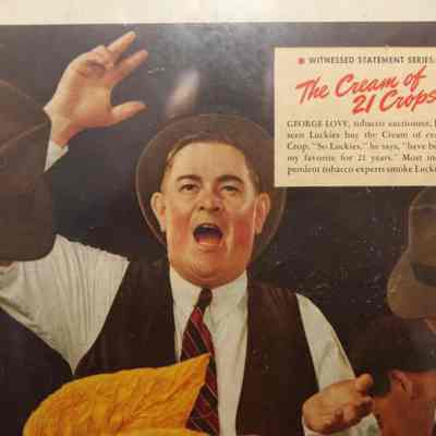 FR. 1930'S COLOR MAG. ADV. TOBACCO AUCTIONEER FOR LUCKY STRIKE. 10 1/2X14". AUCTIONEER: GEORGE LOVE SHOWN SELLING. HE IS QUOTED AS SAYING "SO LUCKIES HAVE BEEN MY FAVORITE FOR 21 YEARS. "EASY ON YOUR THROAT BECAUSE IT'S TOASTED. THIS WAS PART OF THE WITNESSED STATEMENT SERIES. GREAT GRAPHICS IN FULL COLOR.Created By