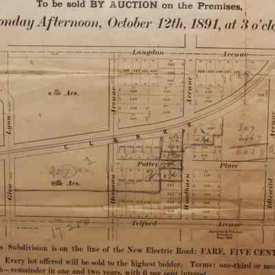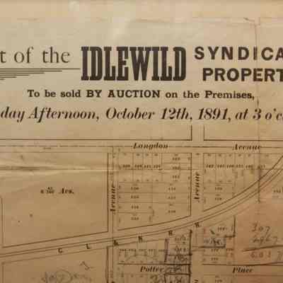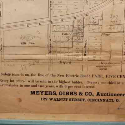 FR. 1891 OHIO REAL ESTATE AUCTION HANDBILL. 9 1/2X10 1/2". AUCTIONEERS MEYERS, GIBBS & CO. FROM 122 WALNUT ST. CINCINNATI, OHIO OFFERED LOTS FROM A SUBDIVISION KNOWN AS "PLAT OF THE IDLEWILD SYNDICATE PROPERTY", THAT IS ON THE LINE OF THE "NEW ELECTRIC ROAD. FARE FIVE CENTS. EVERY LOT OFFERED WILL BE SOLD TO THE HIGHEST BIDDER. TERMS: 1/3 OR MORE CASH - REMAINDER IN ONE AND TWO YEARS, WITH 6% INTEREST, GREAT DETAILED MAP OF SUBDIVISION.Created By