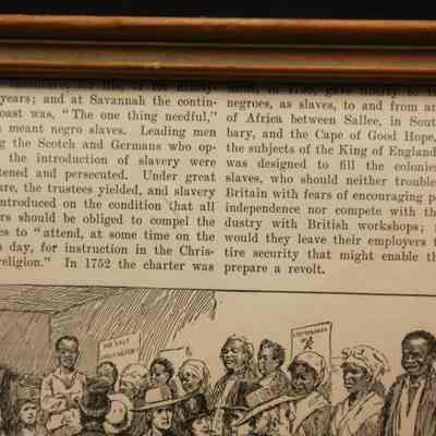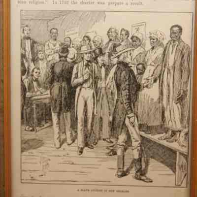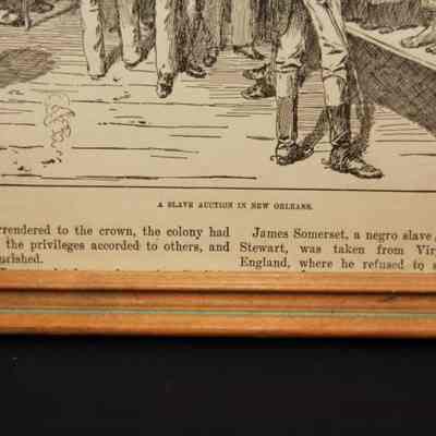 FR. 19THC ENGRAVING "A SLAVE AUCTION IN NEW ORLEANS" 5X7". A SMALL, BUT DETAILED SCENE OF SLAVES STANDING ON BENCH FOR INSPECTION BY BIDDERS. AUCTIONEER AND CLERK IN BACKGROUND.Created By