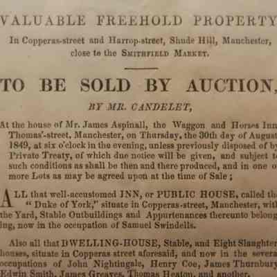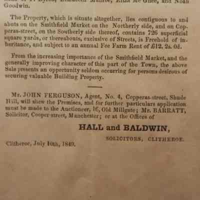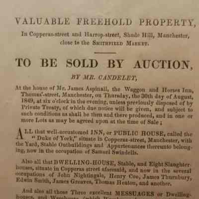 FR. 1840 REAL ESTATE HANDBILL. 7X8 1/2". THIS IS AN AUCTION OF SEVERAL PROPERTIES INCLUCING THE "WAGON AND HORSES INN" AND THE INN KNOWN AS THE "DUKE OF YORK". OTHER PROPERTIES WILL BE SOLD BY AUCTIONEER AT SIX O'CLOCK IN THE EVENING. PROPERTIESCLOSE TO THE SMITHFIELD MARKET. (ENGLAND)Created By