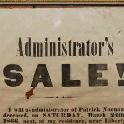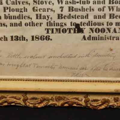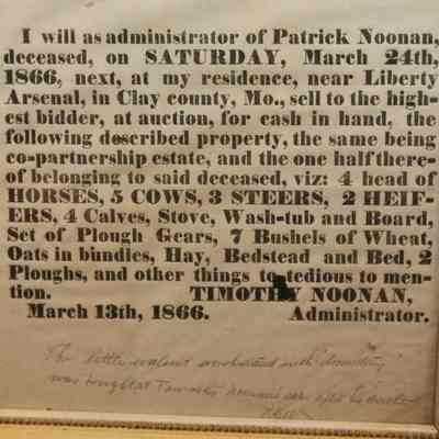 FR. 1866 MO. "ADMINISTRATOR'S SALE" AUCTION BROADSIDE. 9X13". "I WILL AS ADMINISTRATOR OF PATRICK NOONAN DECEASED, ON SATURDAY, MARCH 24TH, 1866, NEXT, AT MY RESIDENCE, NEAR LIBERTY ARSENAL, IN CLAY COUNTY, MO., SELL TO THE HIGHEST BIDDER, AT AUCTION, FOR CASH IN HAND, THE FOLLOWING DESCRIBED PROPERTY, THE SAME BEING CO-PARTNERSHIP ESTATE, AND THE ONE HALF THERE OF BELONGING TO SAID DECEASED, VIZ: 4 HEAD OF HORSES, 5 COWS, 3 STEERS, 2 HEIFERS, 4 CALVES, STOVE, WASHTUB AND BOARD, SET OF POUGH GEARS, 7 BUSHELS OF WHEAT, OATS IN BUNDLES, HAY, BEDSTEAD AND BED, 2 PLOUGHS, AND OTHER THINGS TOO TEDIOUS TO MENTION." SIGNED TIMOTHY NOONAN, ADMINISTRATOR. NOTE: THERE IS A HANDWRITTEN NOTE IN PENCIL AT BOTTOM "THE LITTLE WALNUT WASHSTAND WITH "DORMITORY" WAS BOUGHT AT TIMOTHY NOONAN'S SALE AFTER HIS DEATH." FANCY FRAME, GREAT EARLY PIECE OF MISSOURI AMERICANA.Created By