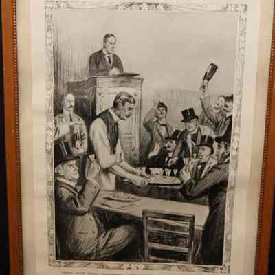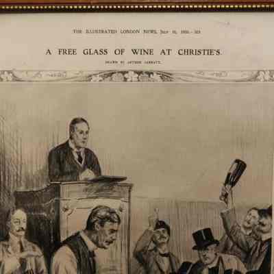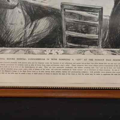 FR. 1910 ENGRAVED WINE AUCTION SCENE FROM ILL. LONDON NEWS. 10 1/2X15 1/2". "A FREE GLASS OF WINE AT CHRISTIE'S DRAWN BY ARTHUR GARRATT." AT THE TOP. UNDER ILLUSTRATION IS - "TASTING BEFORE BIDDING: CONNOISSEURS IN WINE SAMPLING A "LOT" AT THE FAMOUS SALE-ROOMS." THE DETAILED PARAGRAPH BELOW THE ILLUSTRATION DETAILS WHAT IS HAPPENING IN THE SCENE FROM ONE OF CHRISTIE'S WINE AUCTIONS. IN BRIEF, A BOTLE FROM EACH LOT IS OPENNED AND SAMPLED BY ALL SERIOUS BIDDERS, BIDDING COMMENCES IMMEDIATELY. NOTE THE PLATE OF BREAD ON THE TABLE USED FOR REMOVING THE TASTE OF THE PREVIOUS WINE FROM THE MOUTH IN PREPARATION FOR "PREVIEWING" THE NEXT LOT.Created By