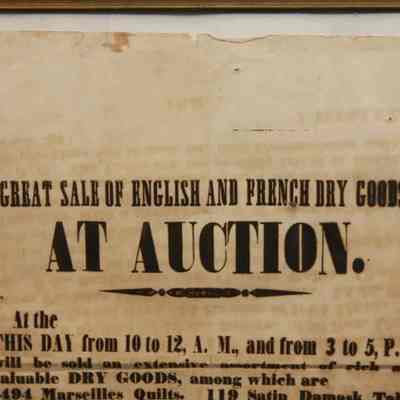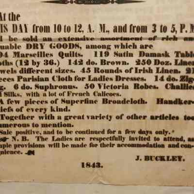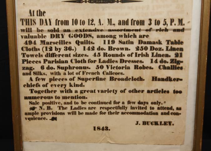 FR. 1843 AMERICAN TRAVELLING AUCTIONEER'S BROADSIDE. 11X14 1/2". FABULOUS AND VERY RARE EARLY AMERICAN ITINERANT AUCTIONEER'S BROADSIDE ON "RAG" PAPER. AUCTIONEER J. BUCKLEY WAS FEATURING A "GREAT SALE OF ENGLISH AND FRENCH DRY GOODS AT AUCTION" OFFERINGCreated By