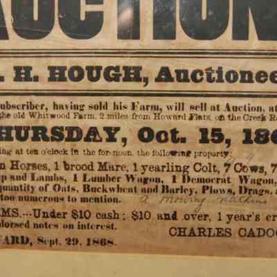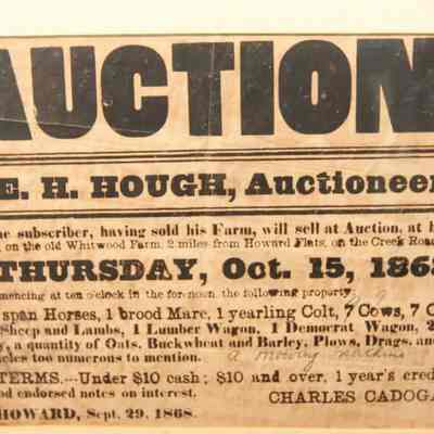 FR. 1868 FARM AUCTION BROADSIDE. 8X10". E.H. HOUGH AUCTIONEER. "THE SUBSCRIBER, HAVING SOLD HIS FARM, WILL SELL AT AUCTION AT HIS RESIDENCE ON THE OLD WHITWOOD FARM, 2 MILES FROM HOWARD FLATS ON THE CREEK ROAD ON THURSDAY OCT. 15, 1868, COMMENCING AT TEN O'CLOCK IN THE FORENOON, THE FOLLOWING PROPERTY: 1 SPAN OF HORSES, 1 BROOD MARE, 1 YEARLING COLT, 7 COWS (CHANGED TO 9 BY HAND WRITING), 7 CALVES, 70 SHEEP AND LAMBS, 1 LUMBER WAGON, 1 DEMOCRAT WAGON, 25 TONS OF HAY, A QUANTITY OF OATS, BUCKWWHEAT AND BARLEY, PLOWS, DRAGS, AND OTHER ARTICLES TO NUMEROUS TO MENTION. ADDED IN SCRIPT BY AUCTIONEER "A MOWING MACHINE". THE TOWN WAS "HOWARD". NO STATE GIVEN. AUCTIONS WERE LOCAL EVENTS.Created By