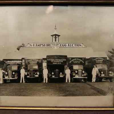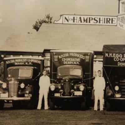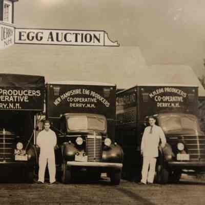 FR. EARLY 20THC NEW HAMPSHIRE EGG AUCTION PHOTO. 7 1/2X9". FABULOUS PHOTOGRAPH OF FIVE TRUCKS WITH DRIVERS IN WHITE UNIFORMS ADVERTISING "N.H. EGG PRODUCERS CO-OPERATIVE DERRY, N.H." NO DATE.Created By