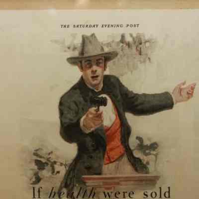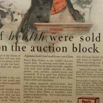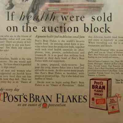 FR. 1926 "IF HEALTH WERE SOLD ON THE AUCTION BLOCK" POST BRAN FLAKES MAG. ADV. 10X14". FANTASTIC FULL PAGE ADV. FROM SATURDAY EVENING POST DEPICTING WELL DRESSED AUCTIONEER WITH AUCTION HAMMER AT PODIUM WEARING COWBOY HAT STATING "COME NOW, YOU WHO ARE IN THE BLOOM OF ENERGY AND HEALTH - WHAT WILL YOU TAKE FOR THESE POSSESSIONS? THERE ARE PLENTY OF BIDDERS. MILLIONS STAND READY TO PAY YOU HANDSOMELY. SPEAK UP! ARE THERE ANY TAKERS? WHO HAS HEALTH FOR SALE?" AUCTION MARKETING IN A POSITIVE LIGHT.Created By