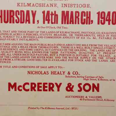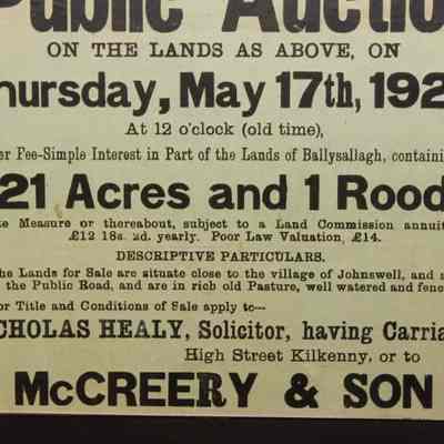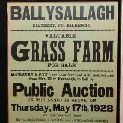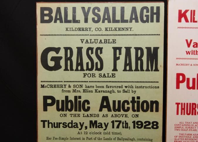 PAIR OF MC CREERY & SONS IRISH MOUNTED BROADSIDES. 11X16". A. 1928 "BALLYSALLAGH" VALUABLE GRASS FARM FOR SALE." B. 1940 REAL ESTATE AND VALUABLE GRASS FARM. BOTH POSTERS ARE FOR AUCTIONS IN KILKENNY, IRELAND.Created By