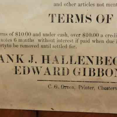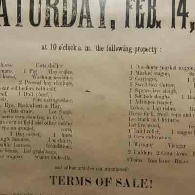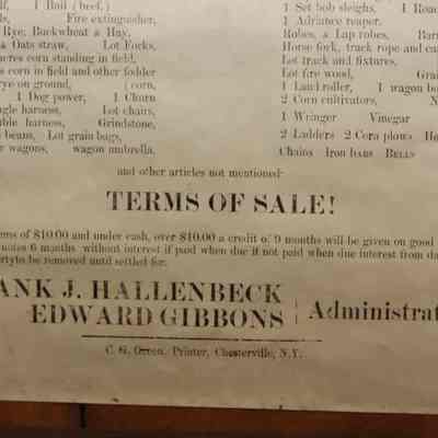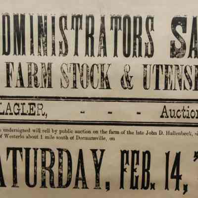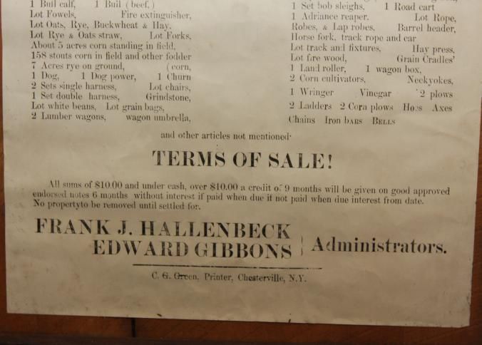 FR. 1903 NY "FARM STOCK & UTENSILS" AUCTION BROADSIDE. 12X17". AUCTIONEER P. FLAGLER WAS SELLING FOR THE ADMINISTRATORS OF JOHN D. HALLENBECK'S ESTATE ON THE FARM OF THE LATE JOHN D. HALLENBECK, SITUATED IN THE TOWN OF WESTERLO ABOUT 1 MILE SOUTH OF DORMANSVILLE, ON SATURDAY, FEB. 14, 03 AT 10 O'CLOCK AM. THE BROADSIDE PROVIDES AN EXTENSIVE LIST OF LIVESTOCK, EQUIPMENT WAGONS AND CARRIAGES, PRODUCE AND "OTHER ARTICLE NOT MENTIONED.Created By