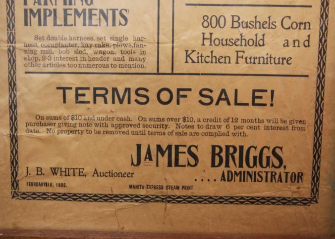 FR. 1899 ILL. ESTATE AUCTION BROADSIDE. 11 1/2X17". AUCTIONEER J.B. WHITE WAS SELLING FOR ADMINISTRATOR JAMES BRIGGS THE EFFECTS AND PERSONAL PROPERTY OF THE LATE HENRY F. BRIGGS. THE AUCTION WAS TO TAKE PLACE "6 MILES SOUTHEAST OF MANITO; AND 5 MILES SOUTHWEST OF GREEN VALLEY, TOWN OF MANITO AND STATE OF ILLINOIS." THE DETAILED LISTING INCLUDED 1 BAY MARE - 150 BUSHELS OF WHEAT, 100 BUSHELS OF OATS AND 15 TONS OF HAY. THERE WERE ALSO 4 HEAD OF CATTLE, 800 BUSHELS OF CORN, FARM IMPLEMENTS AND HOUSEHOLD AND KITCHEN FURNITURE. TERMS: $10. AND UNDER CAHS. oVER $10. A CREDIT OF 12 MONTHS WILL BE GIVEN PURCHASER GIVING NOTE WITH APPROVED SECURITY. NOTES TO DRAW 6% INTEREST FROM DATE.Created By