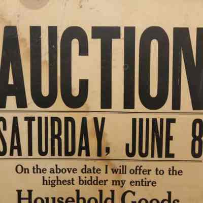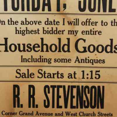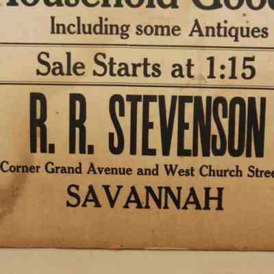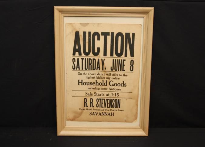 FR. EARLY 20THC GA. HOUSEHOLD & ANTIQUES AUCTION BROADSIDE. 11X14". "AUCTION SATURDAY, JUNE 8TH, ON THE ABOVE DATE I WILL OFFER TO THE HIGHEST BIDDER MY ENTIRE HOUSEHOLD GOODS INCLUDING SOME ANTIQUES. SALE STARTS AT 1:15. R.R. STEVENSON, CORNER GRAND AVENUE AND WEST CHURCH STREETS SAVANNAH." SIMPLE AND TO THE POINT. NO STATE OR YEAR AS AUCTIONS WERE LOCAL AND SHORT NOTICE. I ASSUME GEORGIA BY "SAVANNAH"Created By