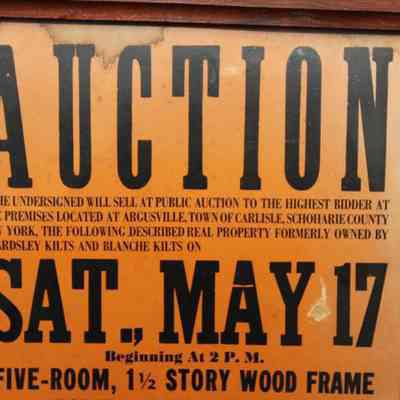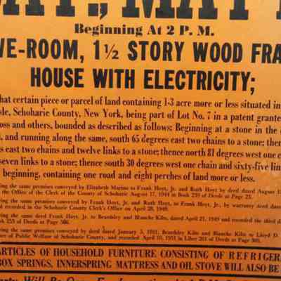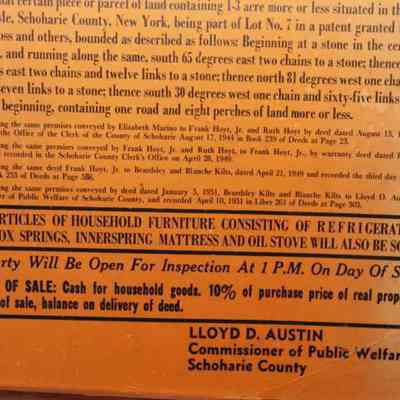 FR. 1951 NY MUNICIPAL REAL ESTATE AUCTION BROADSIDE. 11X17". THIS AUCTION WAS CONDUCTED BY LOYD D. AUSTIN COMMISSIONER OF PUBLIC WELFARE SCHOHARIE COUNTY, NY ON SATURDAY MAY 17TH. HE OFFERED A FIVE ROOM, 1 1/2 STORY WOOD FRAME HOUSE WITH ELECTRICITY. AUCTION WAS SCHEDULED FOR 2PM. ALITTLE PERSONAL PROPERTY WOULD ALSO BE SOLD.Created By