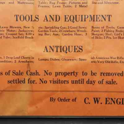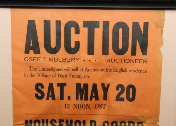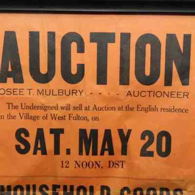 FR. C-1930'S NY HOUSEHOLD & ANTIQUES AUCTION BROADSIDE. 12X17". AUCTIONEER OSEE T. MULBURY SOLD FOR C.W. ENGLISH AT HIS RESIDENCE IN THE VILLAGE OF WEST FULTON ON SAT. MAY 20TH AT 12 NOON HOUSEHOLD GOODS, TOOLS, EQUIPMENT AND ANTIQUES. IT LOOKS LIKE A COMPLETE SELL OUT. TERMS WERE CASH, "NO PROPERTY TO BE REMOVED UNTIL SETTLED FOR. NO VISITORS UNTIL DAY OF SALE. (LAST TWO TERMS POPULAR STARTING IN THE LATE 1920'S).Created By
