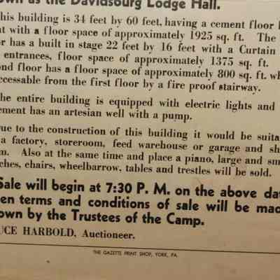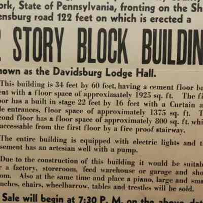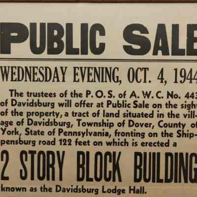 FR. 1944 PA. REAL ESTATE AUCTION BROADSIDE. 11X15 1/2". AUCTIONEER BRUCE HARBOLD WAS SELLING THE "DAVIDSBURG LODGE HALL" BY ORDER OF THE TRUSTEES OF THE CAMP ON WED. EVENING OCT. 4TH 1944. THE AUCTION TOOK PLACE IN THE VILLAGE OF DAVIDSBURG, COUNTY OF YOR, STATE OF PENNSYLVANIA ON SHIPPENSBURG RD. AUCTION WAS TO HAPPEN AT 7:30PM. VERY DETAILED DESCRIPTION.Created By
