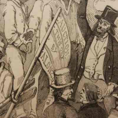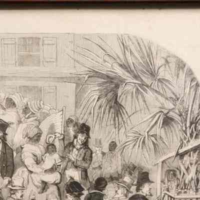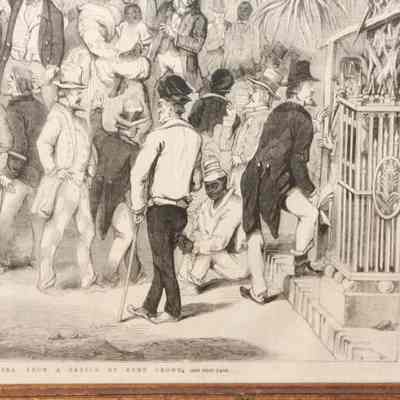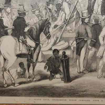 FR. 1856 ENGRAVING OF "SLAVE SALE, CHARLESTON, SOUTH CAROLINA". 10X15". THIS DETAILED SCENE IS A FULL PAGE FROM THE ILLUSTRATED LONDON TIMES. THIS SC. SCENE SHOWS THE AUCTIONEER IN THE CENTER WITH "AUCTION THIS DAY" FLAG NEXT TO HIM, A LARGE CROWD OF "DRESSED UP" SLAVES ON "THE BLOCK" AND LOTS OF MEN INSPECTING AND BIDDING. COMPLETE WITH NEWSPAPER STORY ON BACK.Created By
