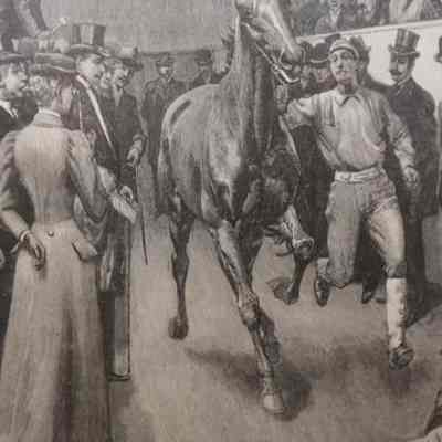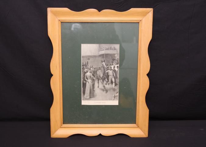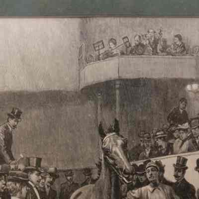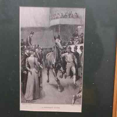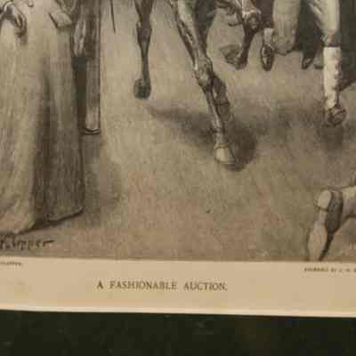 FR. 19THC ENGRAVING OF A HORSE AUCTION "A FASHIONABLE AUCTION". 5X8" FRAMED AND MATTED TO 14X17". GREAT DETAIL SHOWING THE HORSE HANDLER MOVING THE HORSE IN THE RING WHILE AUCTIONEER WITH HAMMER AND TOP HAT CONDUCTS AUCTION TO A WELL DRESSED VICTORIAN CROWD.Created By