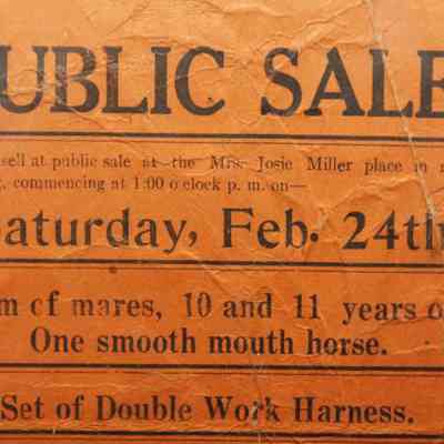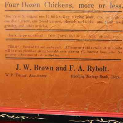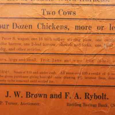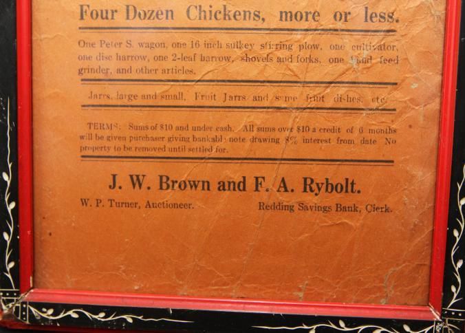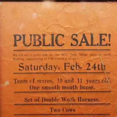 FR. LATE 19THC CA. "PUBLIC SALE!", LIVESTOCK, WAGON, TOOLS - BROADSIDE. 5 1/2X9". AUCTIONEER W.P. TURNER WAS SELLING ITEMS BELONGING TO J.W. BROWN AND F.A. RYBOLT AT "MRS. JOSIE MILLER PLACE IN NORTH REDDING COMMENCING AT 1:00 O'CLOCK P.M. ON SATURDAY, FEB. 24TH..." GOES ON TO DESCRIBE TEAM OF MARES, 10 AND 11 YEARS OLD, ONE SMOOTH MOUTH HORSE, SET OF DOUBLE WORK HARNESS, TWO COWS, 4 DOZE CHICKENS, MORE OR LESS. THEY WERE ALSO OFFERING A "PETER S. WAGON, 16" SULKEY, STIRRING PLOW, 1 CULTIVATOR, 1 DISC HARROW, 1 TWO LEAF HARROW, SHOVELS, FORKS, AND OTHER ARTICLES. TERMS: SUMS UNDER TEN DOLLARS CASH. PURCHASES OVER $10. CREDIT FOR 6 MONTHS AT 8%.Created By