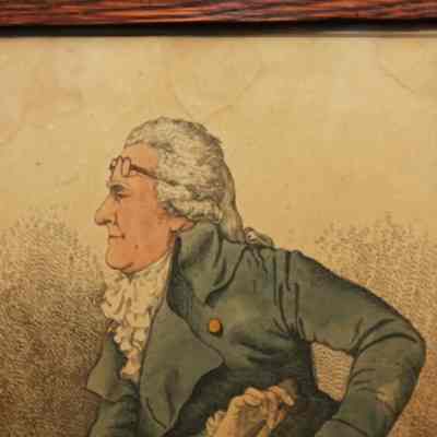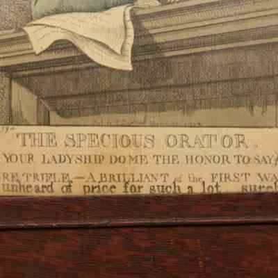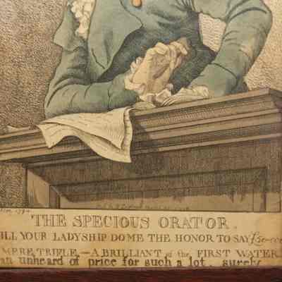 FR. 18THC COLORED ENGRAVING OF AUCTIONEER AT PODIUM. 5 1/2X7 1/2". "THE SPECIOUS ORATOR" THERE IS A QUOTE BELOW TITLE "WILL YOUR LADYSHIP DO ME THE HONOR TO SAY (50 POUNDS) - A MERE TRIFLE - A BRILLIANT OF THE FIRST WATER - AN UNHEARD OF PRICE FOR SUCH A LOT - SURELY." oBVIOUSLY AN ENGLISH AUCTIONEER WITH WHIG.Created By