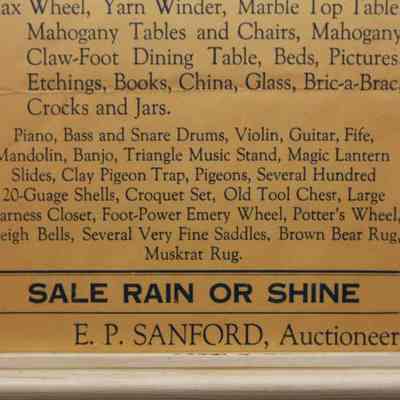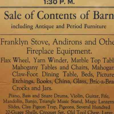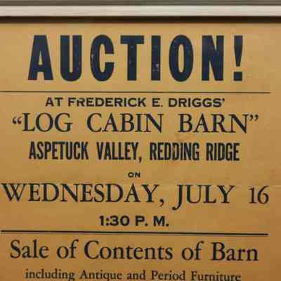 FR. EARLY 20THC CT. "CONTENTS OF BARN" AUCTION BROADSIDE. 6X10". AUCTIONEER E.P. SANFORD WAS SELLING THE CONTENTS OF FREDERICK DRIGGS "LOG CABIN BARN" ASPETUCK VALLEY, REDDING RIDGE ON WED. JULY 16 AT 1:30PM. A NICE LISTING INCLUDING ANTIQUES. "SALE RAIN OR SHINE" (I BELIEVE, THIS VERBAGE STARTED TO BE ADDED TO BROADSIDES ABOUT 1920)Created By