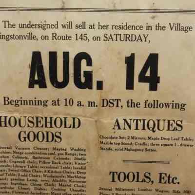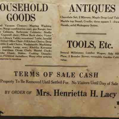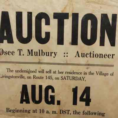 FR. C-1930'S NY. HOUSEHOLD, ANTIQUES & TOOLS AUCTION BROADSIDE. 12X19". AUCTIONEER OSEE T. MULBURY WAS SELLING BY ORDER OF MRS. HENRIETTA H. LACY T HER RESIDENCE IN THE VILLAGE OF LIVINGSTONVILLE, ON ROUTE 145 (OUTSIDE ALBANY, NY) ON SAT. AUG. 14 AT 10AM. A COUPLE OF PHRASES THAT SEEMED TO BECOME POPULAR FROM ABOUT 1930 "NO PROPERTY TO BE REMOVED UNTIL SETTLED FOR" AND "NO VISITORS UNTIL DAY OF SALE." DETAILED LISTING. TERMS - CASH.Created By