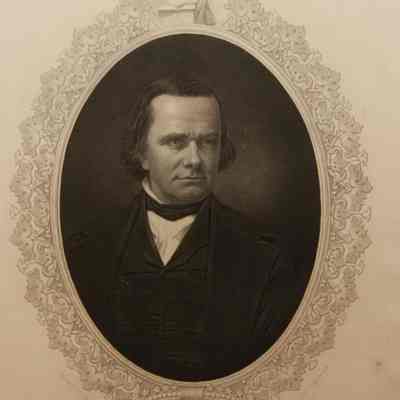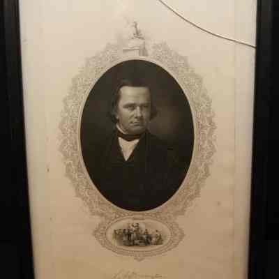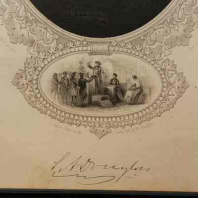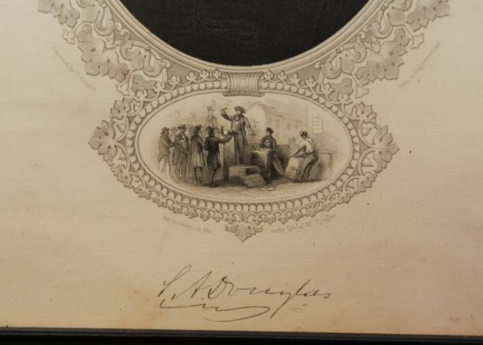FR. PHOTO OF SENATOR STEPHEN ARNOLD DOUGLASS, AUCTIONEER. 6 1/2X9 1/2". ACTUALLY AN ENGRAVING OF SENATOR DOUGLAS, STANDING ABOUT 4 1/2 FEET TALL, HE WAS KNOWN AS "THE LITTLE GIANT" WHEN HE DEBATED ABRAHAM LINCOLN BACK IN THE TIME OF SLAVERY IN AMERICA. THIS BOOKPLATE PAGE HAS HIS PORTRAIT AS TAKEN FROM A DAGUEREOTYPE OVER A VIGNETTE OF AN AUCTION WITH DOUGLAS AS THE AUCTIONEER. A COPY OF HIS SIGNATURE BELOW.Created By