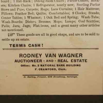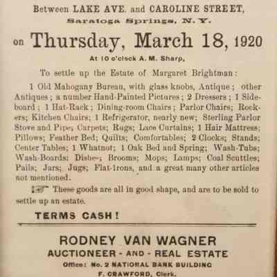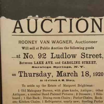 FR. 1920 NY. ESTATE AUCTION BROADSIDE. 5X8". RODNEY VAN WAGNER, AUCTIONEER AND REAL ESTATE AGENT WITH OFFICES AT NO. 2 NATIONAL BANK BUILDING SARATOGA SPRINGS, NY WAS SELLING THE ESTATE OF MARGARET BRIGHTMAN AT NO. 92 LUDLOW ST. SARATOGA SPRINGS, NY ON THURS. MAR. 18 AT 10AM. GREAT LISTING OF PERSONAL PROPERTY, MUCH OF WHICH WOULD BE CONSIDERED ANTIQUES TODAY.Created By