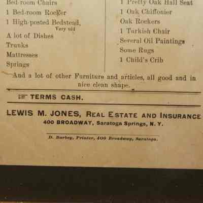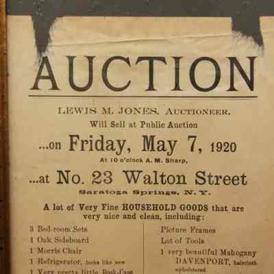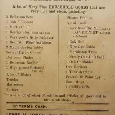 FR. 1920 NY. HOUSEHOLD AUCTION BROADSIDE. 5 1/2X9". AUCTIONEER LEWIS M. JONES WAS SELLING A LOT OF VERY FINE HOUSEHOLD GOODS THAT ARE VERY NICE AND CLEAN ON FRI. MAY 7TH AT NO. 23 WALTON STREEET SARATOGA SPRINGS, NY. TERMS CASH. GREAT DETAILED LISTING.Created By