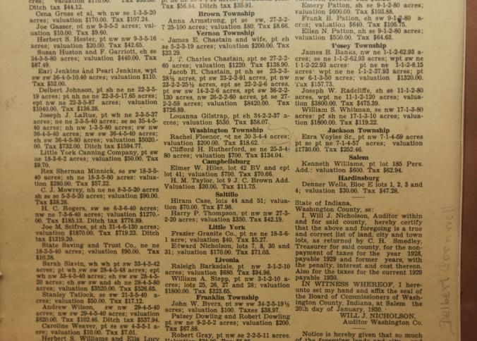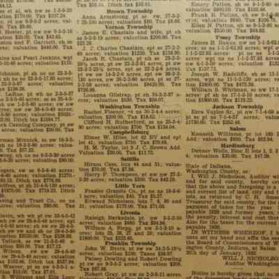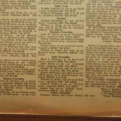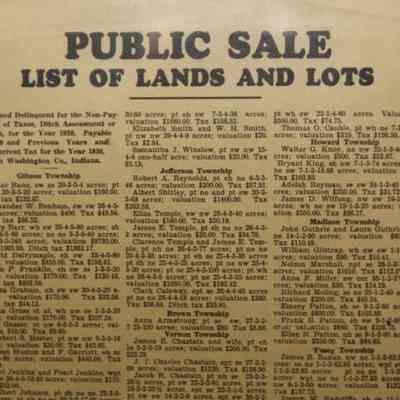 FR. 1930 IND. "TAX FORECLOSED REAL ESTATE" AUCTION BROADSIDE. 8X13". A LONG LIST OF PROPERTIES FROM WASHINGTON COUNTY, INDIANA. LISTED BY TOWNSHIPS. THE AUCTION WAS SCHEDULED FOR MON. FEB. 10TH 1930 AND TO CONTINUE FROM DAY TO DAY UNTIL ALL SAID LOTS AND LANDS ARE SOND THAT ARE OFFERED FOR SALE. HAS LISTING OF DEBTOR, TAX MAP NUMBER, VALUATION, SIZE OF PARCEL AND AMOUNT OWED ON EACH PARCEL.Created By