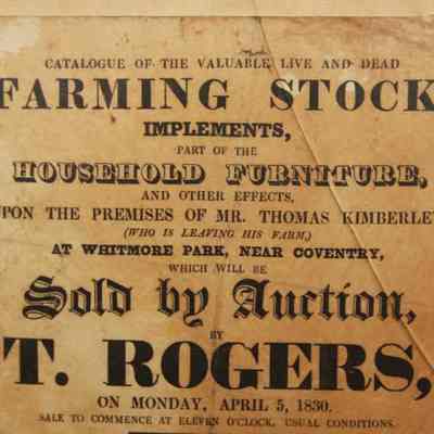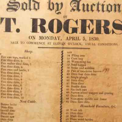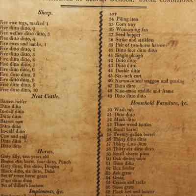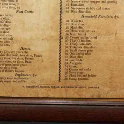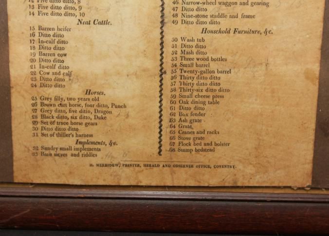 FR. 1830 ENGLISH "LIVE & DEAD FARMING STOCK, IMPLEMENTS, HOUSEHOLD FURNITURE" BROADSIDE. 8X12". THIS EARLY AUCTION WAS FULLY CATALOGED BY AUCTIONEER T. ROGERS FOR MONDAY APRIL 5TH 1830 AT 11AM. THE AUCTION WAS TO TAKE PLACE "UPON THE PREMISES OF MR. THOMAS KIMBERLEY (WHO IS LEAVING HIS FARM)" A TOTAL OF 68 LOTS ARE NUMBERED AND LISTED ON THIS BROADSIDE. CATAEGORIES INCLUDE "SHEEP, NEAT CATTLE, HORSES, IMPLEMENTS & C., HOUSEHOLD FURNITURE, & C.Created By