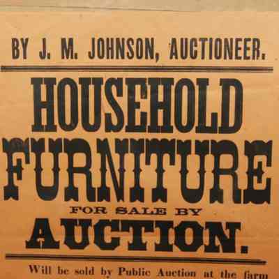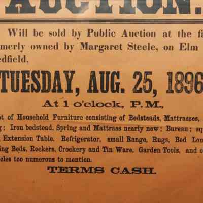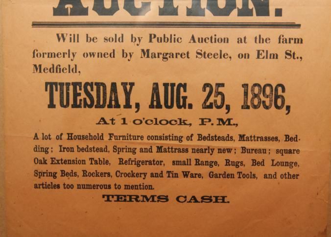 FR. 1896 MA. HOUSEHOLD AUCTION BROADSIDE. 11X15". AUCTIONEER J.M. JOHNSON WAS SELLING FOR MARGARET STEELE ON ELM ST. MEDFIELD ON TUES. AUG. 25, 1896 AT 1 O'CLOCK PM, A LOT OF HOUSEHOLD FURNITURE CONSISTING OF BEDSTEADS, MATTRASSES, BEDDING AND MUCH MORE. TERMS CASH.Created By