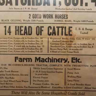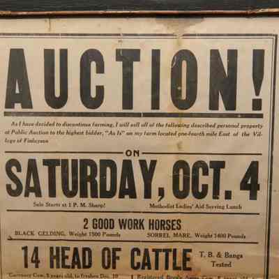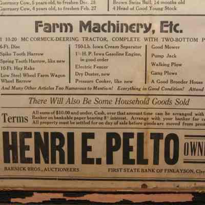 FR. C-1920'S MINN. FARM LIQUIDATION AUCTION BROADSIDE. 11X17" AUCTIONEERS, BARNICK BROS., WERE SELLING FOR HENRI E. PELTO, WHO HAS DECIDED TO DISCONTINUE FARMING AND HAVE A PUBLIC AUCTION TO THE HIGHEST BIDDER, "AS,IS" ON HIS FARM LOCATED 1/4 MILE EAST OF THE VILLAGE OF FINLAYSON ON SAT. OCT. 4 AT 1PM SHARP. "METHODIST LADIES' AID SERVING LUNCH" ( NO "FREE LUNCH" AND WORD "SHARP" BOTH INDICATE 1920'S AUCTION). NO YEAR AS AUCTIONS WERE LOCAL EVENTS AND EVERYONE NEW WHAT YEAR IT WAS. GREAT LISTING OF LIVESTOCK INCLUDING 2 GOOD WORK HORSES - BLACK GELDING - 1500 LBS, AND SORREL MARE - 1400 LBS. 14 HEAD OF CATTLE ALL LISTED, NICE LISTING OF FARM MACHINERY. "THERE WILL ALSO BE SOME HOUSEHOLD GOODS SOLD." TYPICAL "MANY OTHER ARTICLES TOO NUMEROUS TO MENTION" HERE'S A NEAT LINE NOT ENCOUNTERED OFTAIN "EVERYTHING IN GOOD CONDITION! ATTEND SURE!"Created By